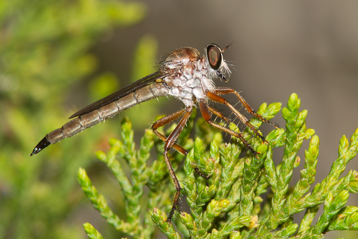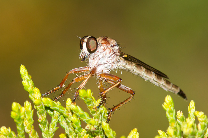| The robber fly in the top 3 images shown here is probably of the genus Polacantha. These 3 images were taken in Austin, Travis Co., Texas, in June, 2010. | ![]() |