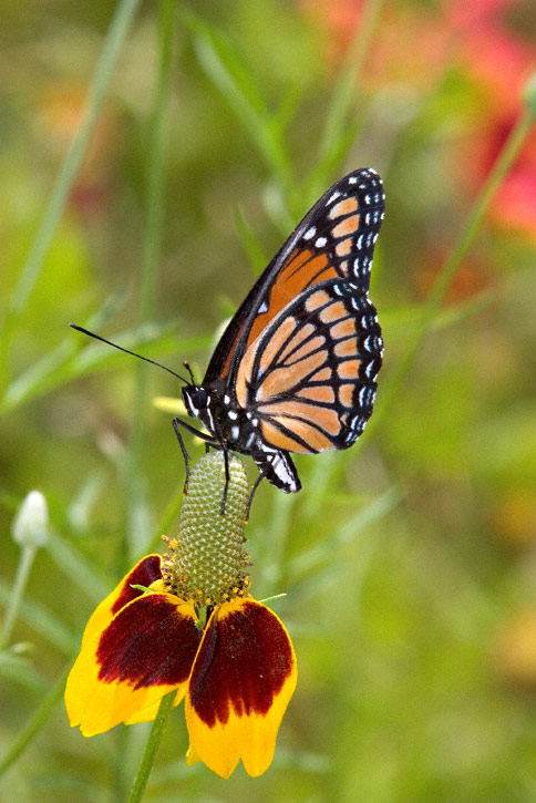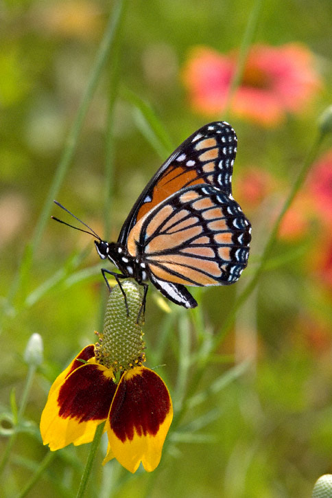 | The Viceroy (Limenitis archippus) is a common butterfly across most of the United States. The first shot here was taken at Palmetto State Park, Gonzales Co., Texas, in June, 2003, with a Canon EOS 10D and an EF 70-200mm F/2.8 L IS lens and 2X extender. The next two shots were shot with the same equipment in May, 2004, in Austin, Travis Co., Texas. | ![]() |