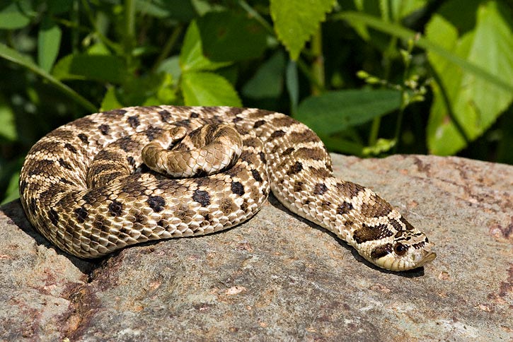 | The Western Hognose Snake (Heterodon nasicus) is a harmless colubrid snake found in much of the western United States as well as parts of western Canada and northern Mexico. The species is considered to be a mildly venomous, rear-fanged species but it poses no threat to man. The venom is used to secure its prey and the species has not been known to bite a human. The first two shots here were taken in Presidio Co., Texas, in September, 2006, with a Canon EOS 1D Mark II and EF 300mm F/4 L IS lens. This particular subspecies is sometimes called Mexican Hognose Snake or Kennerly's Hognose Snake (H. n. kennerlyi). | ![]() |