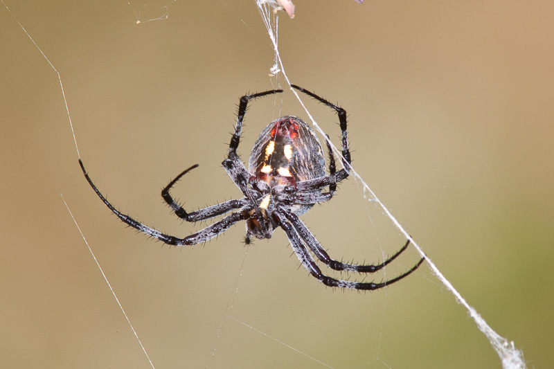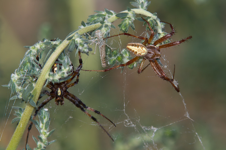 | The two Western Spotted Orbweavers (Neoscona oaxacensis) in the next two shots were at Walker Lake, Mineral Co., Nevada, in August, 2012. These shots were taken with a Canon EOS 1D Mark IV and an EF 300mm F/4 L IS lens and 1.4X extender and 580 flash. |