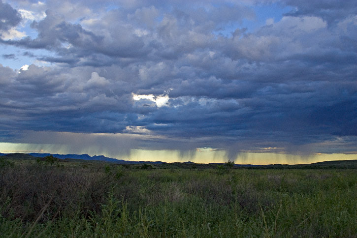 | West Texas Storms. The skies of west Texas may sometimes produce terrific scenes during stormy weather. The first two shots here were taken along Hwy. 17 between Fort Davis and Balmorhea in September, 2006, as thunderstorms marched across the desert toward me. These images were taken with a Canon EOS 1D Mark II and Sigma 12-24mm lens. | ![]() |