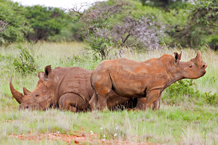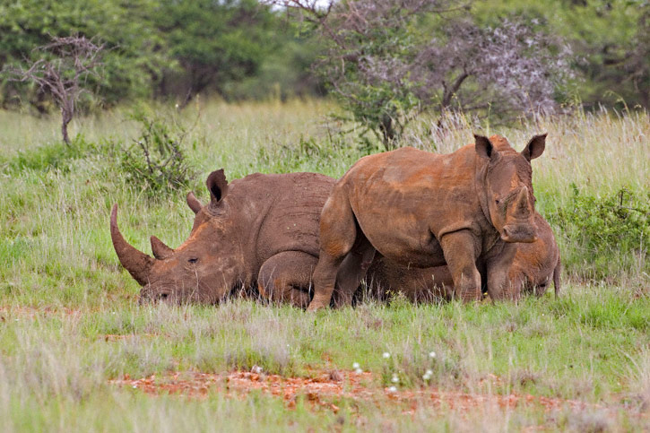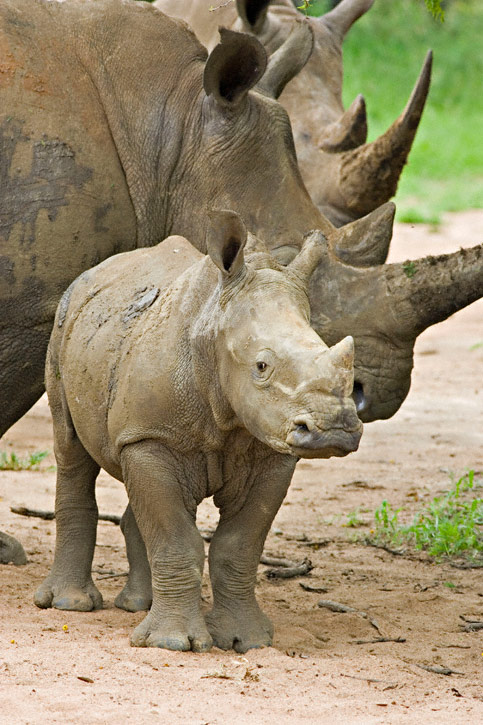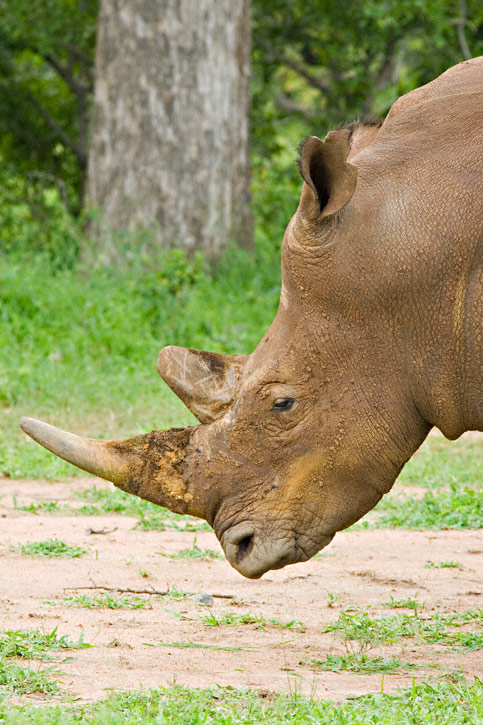 | The White Rhinoceros (Ceratotherium simum) is also known as the Square-lipped Rhinoceros. The latter name is really more appropriate since this animal is not white at all. This animal, and other rhinoceros species, simply take on the color of the mud and dirt which they have most recently been rolling in. They can be white, brown, reddish, or gray. The first three shots here show a mother and calf on the Polokwane Nature Reserve near Pietersburg, Limpopo Province, South Africa, in January, 2006. The next four shots show a few other White Rhinos on a private reserve near Malelane, Mpumalanga Province, South Africa, also in January, 2006. All these shots were taken with a Canon EOS 1D Mark II and an EF 500mm F/4 L IS lens. |