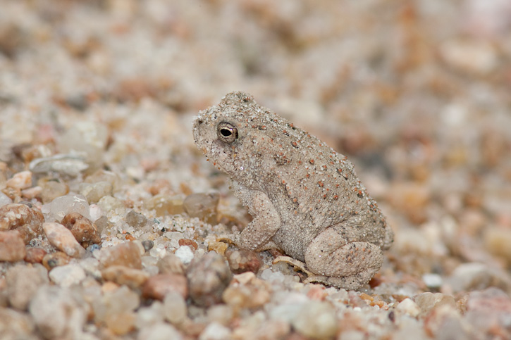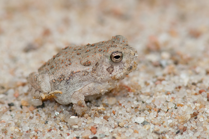 | There is some geographic variation in the appearance of these toads as well as variation according to size. The first 3 images here show a fairly small individual (about 1.5 inches long) that had been burrowing in sand along the edge of a river. Despite the reddish spots on this toad, it is not Red-spotted Toad (Anaxyrus punctatus) as a few folks have suggested to me. That species has round paratoid glands while the present individual has oval glands. |