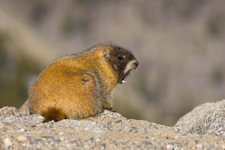 | The next 4 images were taken at the same location as the above shots, Mt. Evans, Colorado, but 6 years later in June, 2007. These are digital images taken with a Canon EOS 1D Mark II and EF 100-400 F/4.5-5.6 L IS lens. In the bottom shot the animal yawned, showing his dental work. |