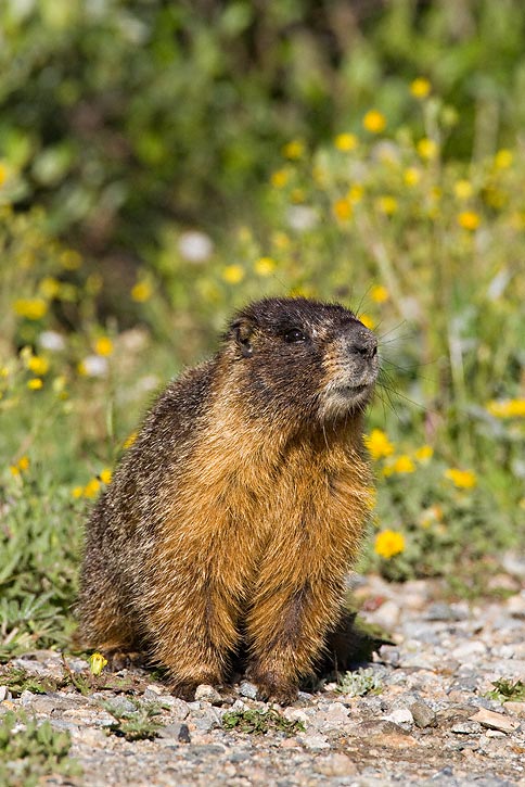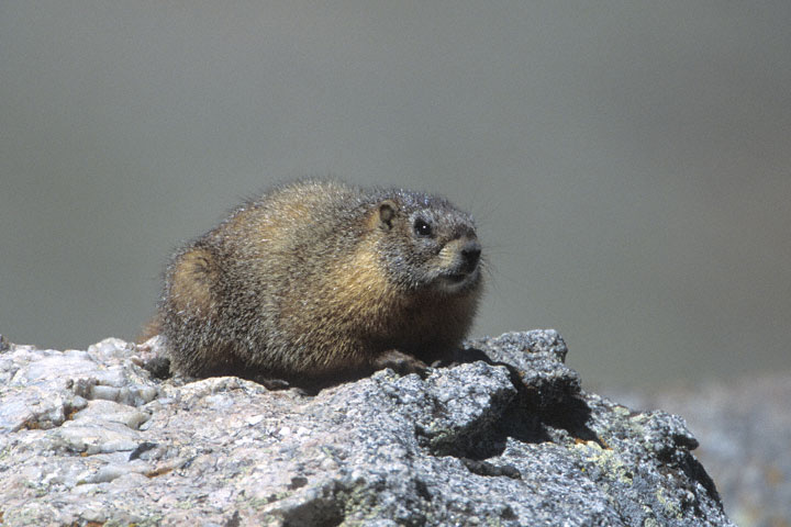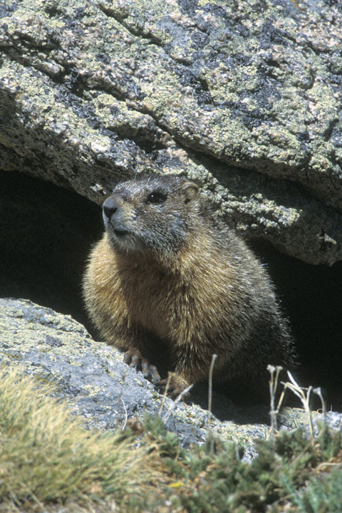 | The Yellow-bellied Marmot (Marmota flaviventris) is a resident of montane areas of the American West. It ranges from parts of southwest Canada down to some areas of southern California and eastward into northern New Mexico. The first 2 shots here were taken on Mt. Evans, Clear Creek Co., Colorado, in June, 2001, with a Canon EOS 3 and EF 300mm F/4 L IS lens on Fuji Velvia. |