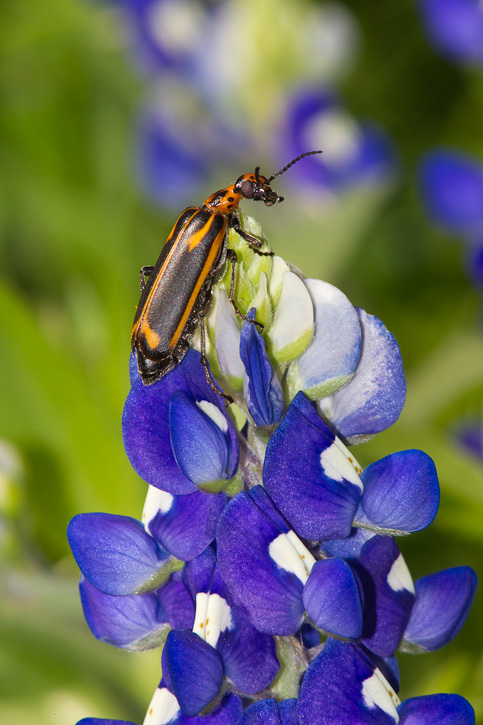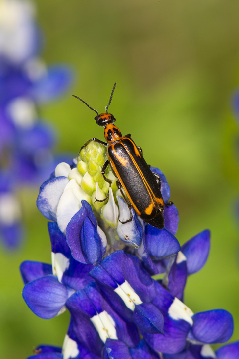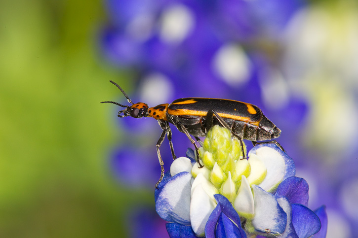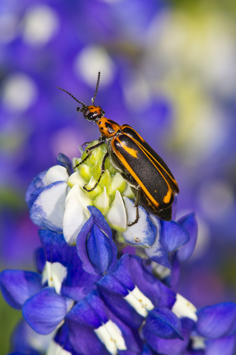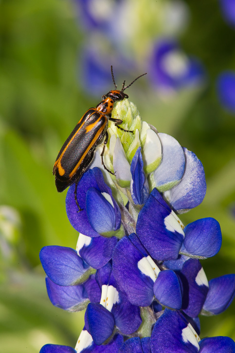 | The Yellow-crescent Blister Beetle (Pyrota insulata) is one of many species commonly called Blister Beetles. If squeezed these beetles may exude an irritant that will cause a blister on human skin. The first 6 shots here show a Yellow-crescent Blister Beetle on a Texas Bluebonnet in April, 2010, in Austin, Travis Co., Texas. These shots were taken with a Canon EOS 1D Mark IV and EF 300mm F/4 L IS lens and 2X extender and Canon 580 flash. | ![]() |