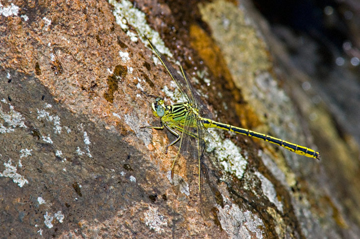 The Yellowjack (Notogomphus praetorius) ranges from forested areas of the Congo and Angola into eastern South Africa. The shots here of a male were taken along a small stream near Dullstroom, Mpumalanga Province, South Africa. These shots were taken in January, 2006 with a Canon EOS 1D Mark II and EF 300mm F/4 L IS lens and 2X extender with a 580 flash. | ![]() |