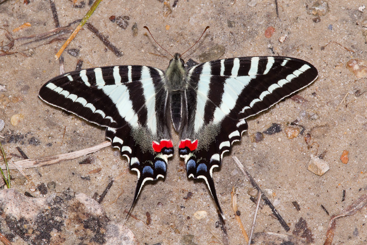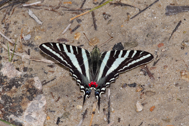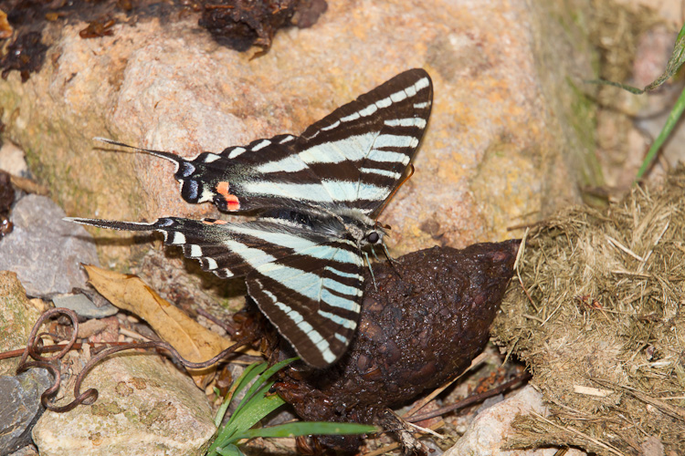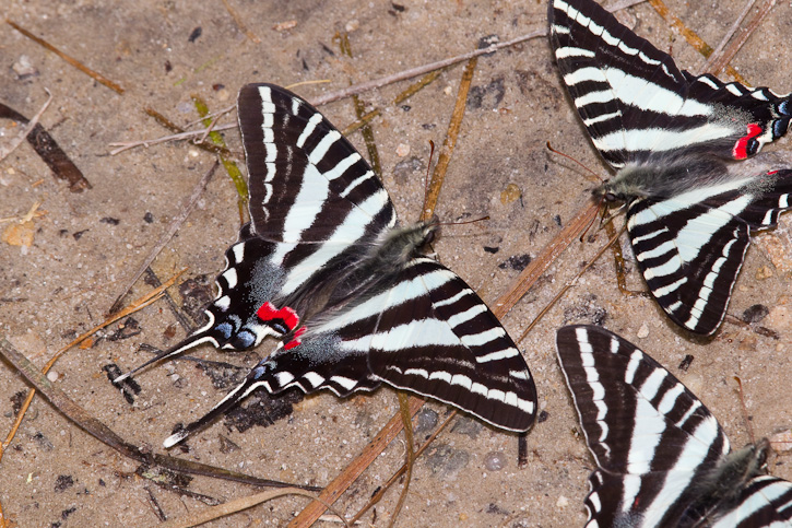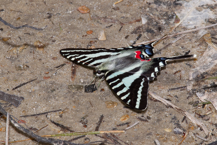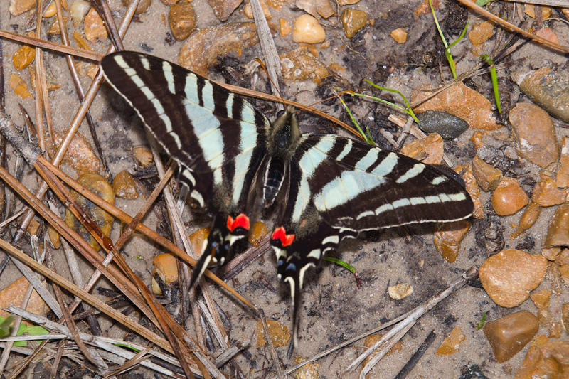 | The Zebra Swallowtail on the right was in the Kisatchie National Forest, Natchitoches Parish, Louisiana, in March, 2012. This image was taken with a Canon EOS 1D Mark IV and a Sigma 50-500mm lens and Canon 580 flash. |