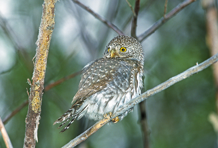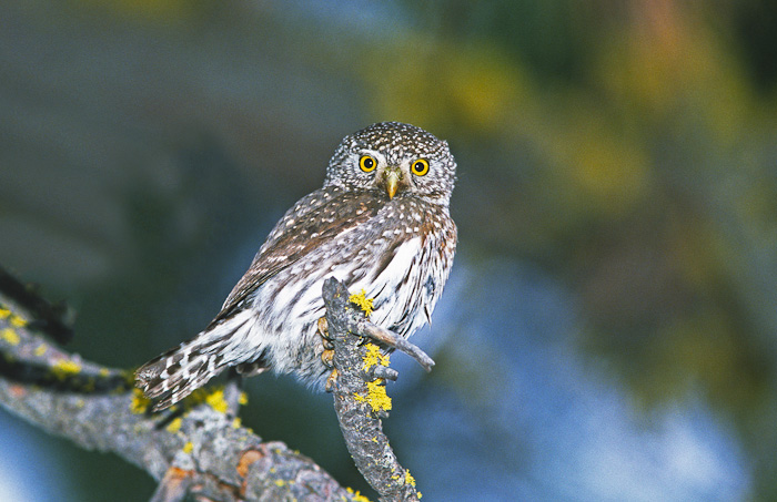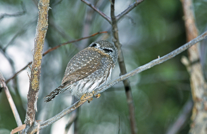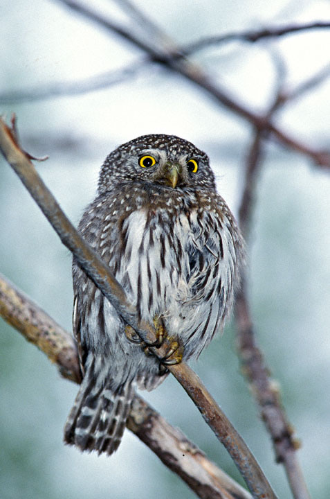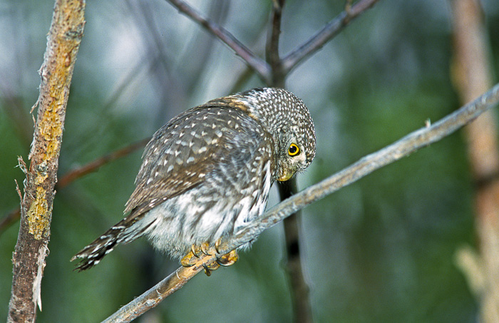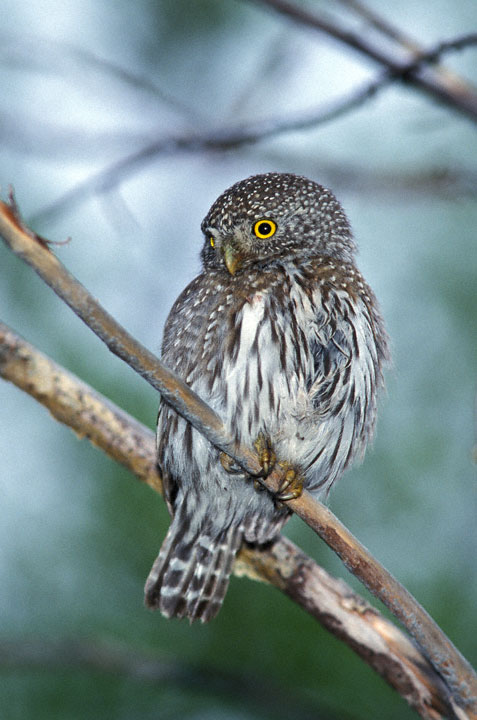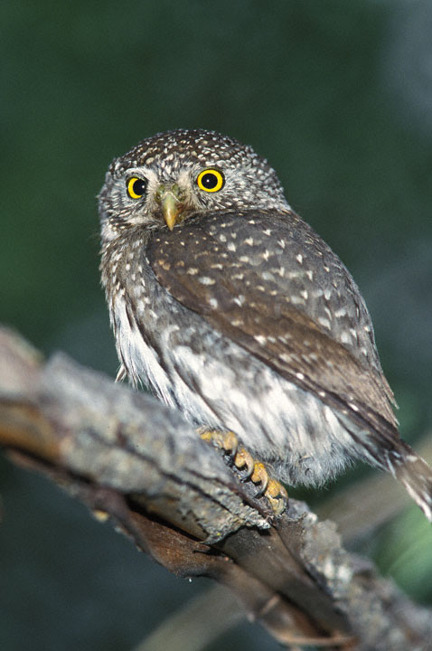 The Northern Pygmy-Owl (Glaucidium gnoma) ranges from southern Alaska all the way to the Honduras. In the U.S., it is a western species and inhabits montane forests along the coast as well as the interior Rockies. Birds from Arizona southward typically give a series of double-noted "hoots" while those farther north give a single hoot repeated every three to five seconds. The individual in the first seven images on this page was photographed in May, 1999, near Ellensburg, Kittitas Co., Washington with a Canon EOS A2 and EF 300 F4L IS & 1.4X extender on Fuji Sensia 100 pushed one stop. Fill flash was also used and the camera was hand held on a BushHawk shoulder mount. This individual was hunting near dusk and came within 15 feet of the observers on several occasions seemingly oblivious to us. |