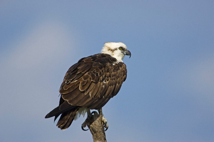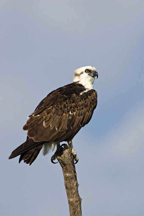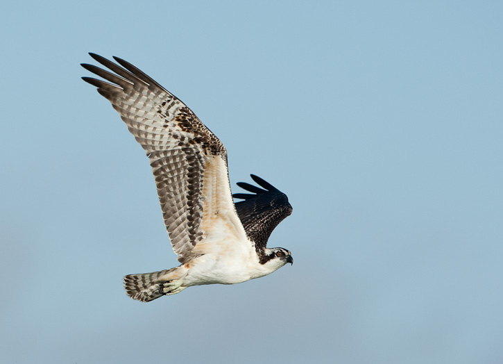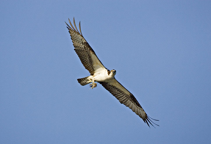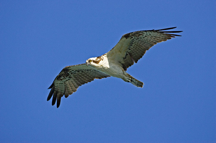 | The Osprey shown here kept a wary eye on me as he passed overhead at Lake Tohopekaliga, Osceola Co., Florida, in March, 2007. This image was taken with a Canon EOS 1D Mark II and EF 500mm F/4 L IS lens and 1.4X extender. | ![]() |