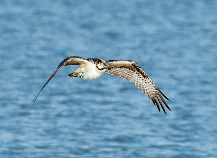 | The Osprey in the next 4 shots was at Balmorhea Lake in Reeves Co., Texas in September, 2009. The first 2 shots show the bird diving toward the water in an attempt to catch a fish, which it missed. The 3rd shot shows the bird shaking water off itself after it took off from the water. The 4th shot shows the bird giving me a good examination as it flew past. These shots were all taken with a Canon EOS 1D Mark III and an EF 500mm F/4 L IS lens and 1.4X extender. | ![]() |
