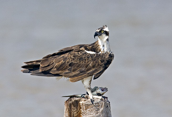 | The Osprey (Pandion haliaetus) occurs across most of north and central America as well as in northern Europe. It can be found all across the United States and Mexico at various seasons so it is a species familiar to most Americans with even a casual interest in wildlife. Ospreys feed on fish and will readily utilize artificial nesting platforms. In Florida, for example, artificial nesting platforms are routinely erected on poles near both coasts, and Ospreys are commonly seen nesting successfully on them. The Osprey immediately below was feeding on a fish near Boca Chica Beach at the mouth of the Rio Grande in Cameron Co., Texas in November 2003. This is a digital image taken with a Canon EOS 10D and EF 600 mm F/4 L IS lens and 1.4 X extender. The next shot shows an Osprey photographed with the same gear at Brady Reservoir, McCulloch Co., Texas, in March, 2004l. | ![]() |