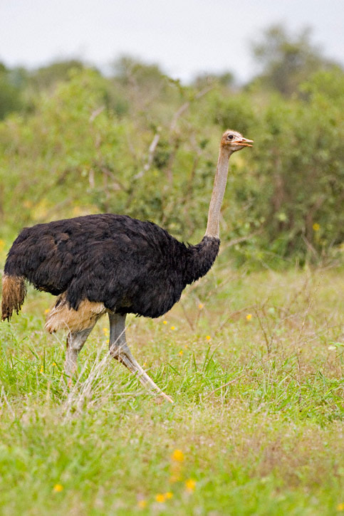 | The Ostrich (Struthio camelus) is one of the signature birds of southern Africa. The three young birds shown here were photographed in October, 1998, in Etosha National Park, Namibia. The photos were taken with a Canon EOS 1N & EF 300mm F2.8L lens on Fuji Sensia 100. The shot at right was taken on the Polokawane Nature Reserve near Pietersburg, South Africa in January, 2006, with a Canon EOS 1D Mark II and EF 70-200mm F/2.8 L IS lens. | ![]() |
