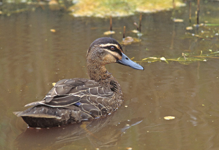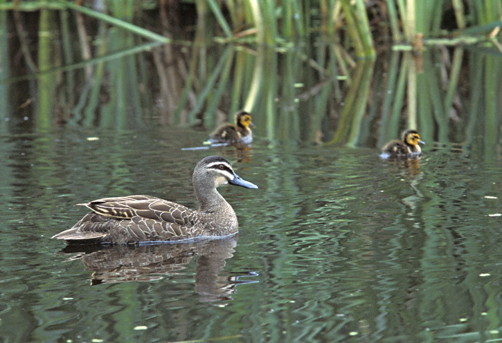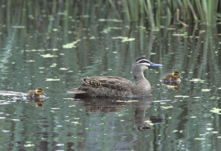 | The Pacific Black Duck (Ansa supercilliosa) is a widespread dabbling duck of much of the Pacific region including Australia, Indonesia, New Guinea and New Zealand. The three shots here were all taken near Hobart, Tasmania, in November, 2001, with a Canon EOS 3 and EF 70-200mm F/2.8 L lens and 2X extender on Fuji Provia film. | ![]() |