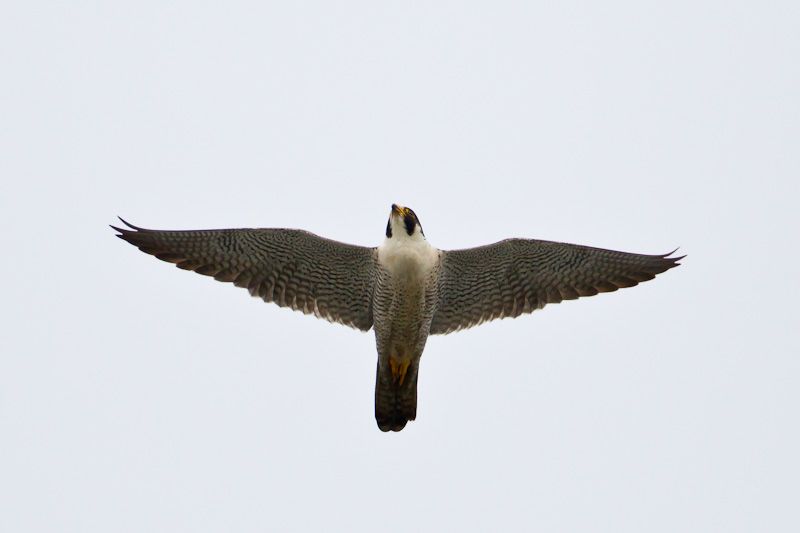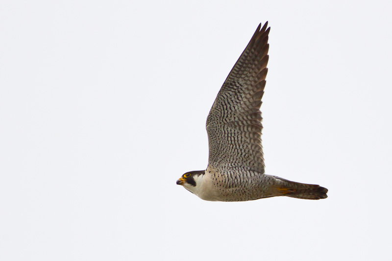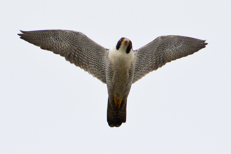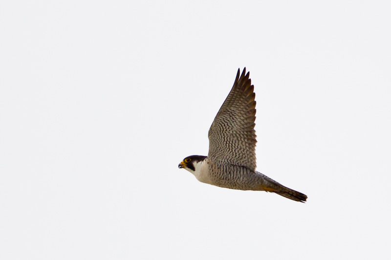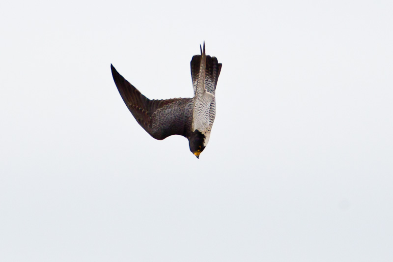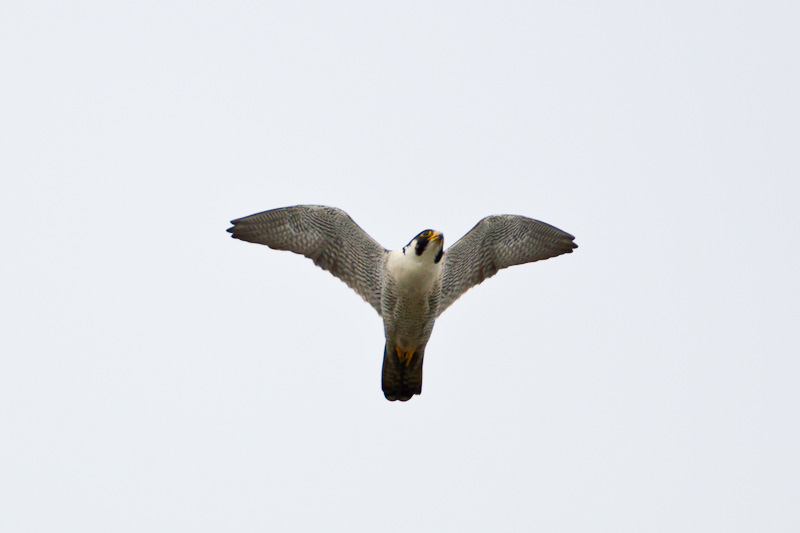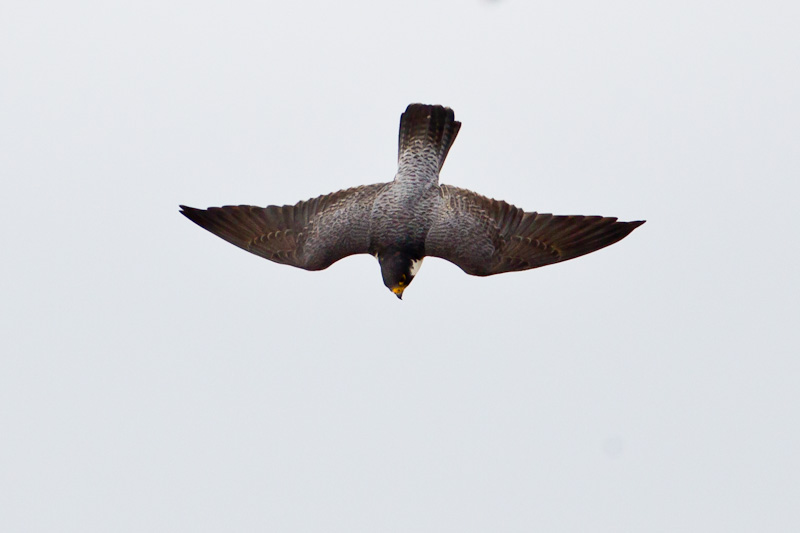 | The next seven shots show a Peregrine Falcon at Nome, Alaska, in June, 2012. The falcon had a nest under a bridge and was in the process of driving a pair of Common Ravens away from the area. |