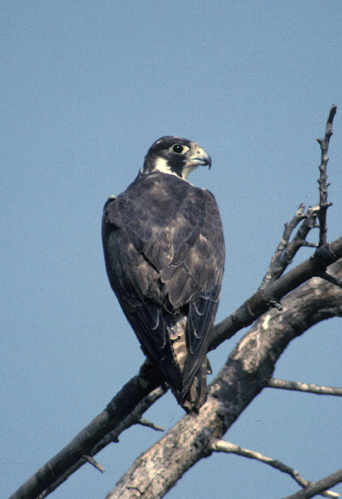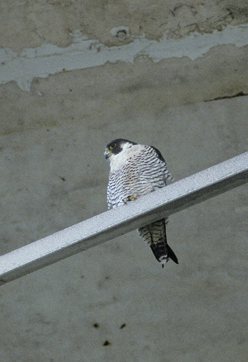 | The Peregrine Falcon (Falco peregrinus) is a worldwide species found on all continents except Antarctica. Within North America, the species my be found almost anywhere, but it primarily breeds in western mountains as well as some montane areas in the east. Wintering birds may often be found in many southern U.S. cities where they cause the local Rock Pigeon populations to be extra vigilant. In the 1970s this species was in a steep population decline, but the banning of DDT as well as placing this species on the Endangered Species list are two factors credited with bringing the bird back to decent numbers. The species was recently taken off the Endangered Species list, a prime example of how that list is supposed to work. I am posting a few old shots of this species here, but hope to be able to take some newer and higher-quality images and add them here in the future. The adult bird shown here was perched on a bridge support in Corpus Christi, Nueces Co., Texas, in March, 1991. It was photographed with a Canon T-90 and FD 400mm F/4.5 lens on Kodachrome 64 film. The next two shots were taken of an immature bird in Austin, Travis Co., Texas in August, 1992 with the same equipment. |