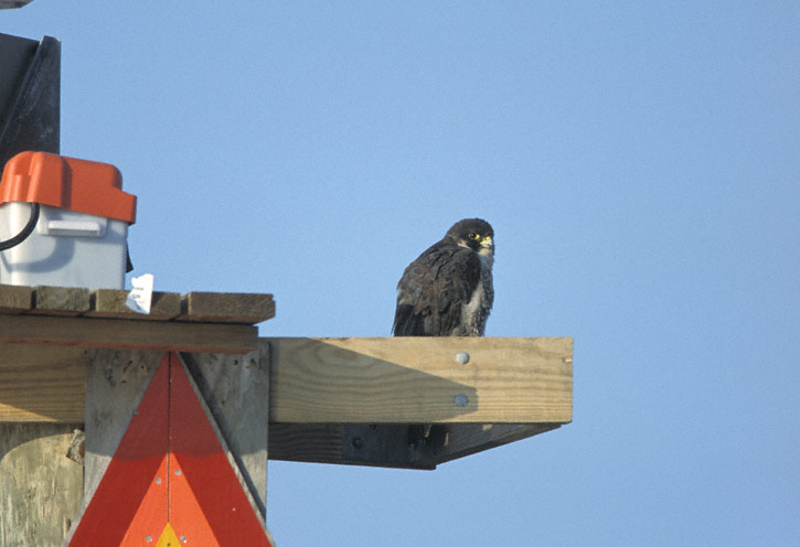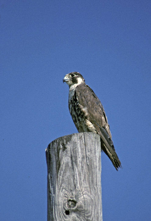 | The adult Peregrine below was perched on a channel marker on Copano Bay, Aransas Co., Texas, in February, 2001.Any passing gull, tern, or other species could end up as prey to this watchful Peregrine. This shot was taken with a Canon EOS 3 and EF 500mm F/4 L IS lens on Fuji Provia film. |