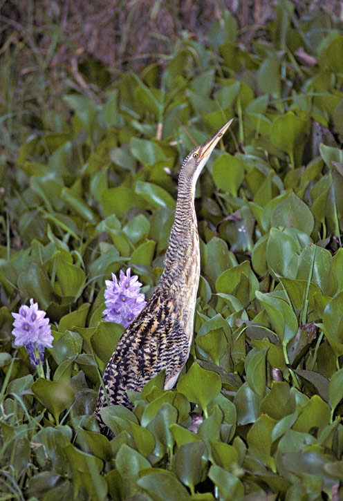 | Pinnated Bittern (Botaurus pinnatus) is a species that is visually similar to the American Bittern (B. lentiginosus) which is more familiar to North American observers. The species ranges from southern Mexico south to Argentina. The individual shown here was photographed in Tabasco, Mexico in April, 1991, with a Canon T-90 & FD 400mm F/4.5 lens using a Fresnel flash on Kodachrome 64 film. The camera and lens were mounted on a Bogen tripod. The next shot at right was photographed in Apure, Venezuela, in April, 1992, with the same equipment but on Kodachrome 200. | ![]() |