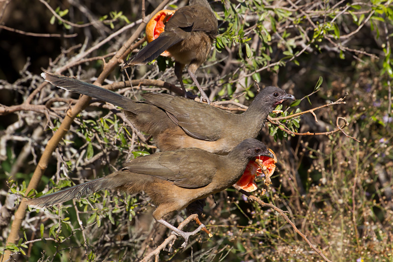 | In south Texas, Plain Chachalacas are often attracted to citrus fruit. In the next two shots, a group of three chachalacas is seen feeding on grapefruit in Weslaco, Hidalgo Co., Texas. These two shots were taken in December, 2010, with a Canon EOS 1D Mark IV and a Sigma 50-500mm lens. |