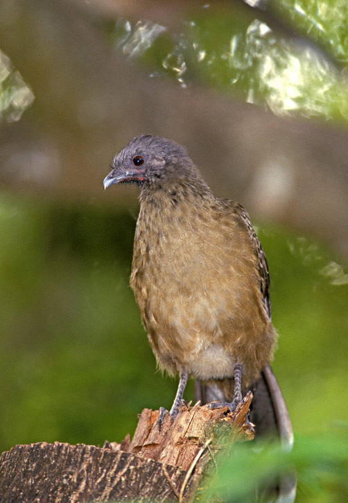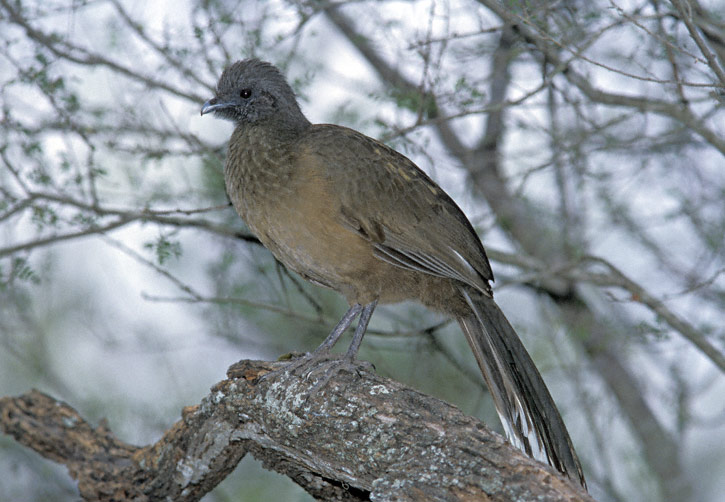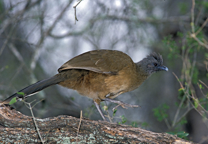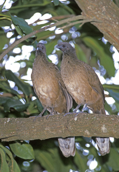 | The Plain Chachalaca (Ortalis vetula) is member of the guan family which ranges from extreme south Texas southward to Costa Rica. It is very elusive and hard to find in areas of the tropics where it is hunted, but in south Texas in many refuges and parks it is common and easy to see. The first two shots shown here were taken at Bentsen State Park, Hidalgo Co., Texas, in February 1999. |