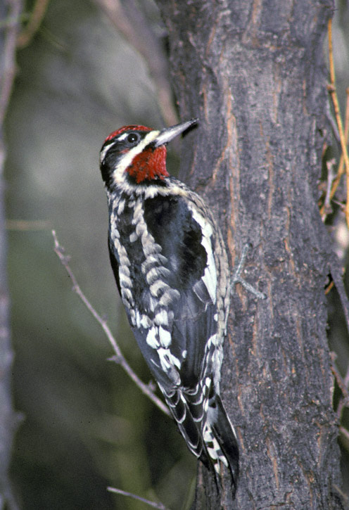 | The Red-naped Sapsucker (Sphyrapicus nuchalis) is the Rocky Mountain and Great Basin representative of the Yellow-bellied Sapsucker complex. The species nests from northern New Mexico and Arizona up through the Rocky Mountains to southern British Columbia. It winters south through the Trans-Pecos of Texas well into Mexico. The male shown here was at Big Bend National Park, Brewster Co., Texas, in December, 1992. This shot was taken with a Canon T-90 and FD 400mm F/4.5 lens on Kodachrome 200 film. The next shot, of another male, was taken at Guadalupe Mountains National Park, Culberson Co., Texas, in December, 1994, with the same equipment. |