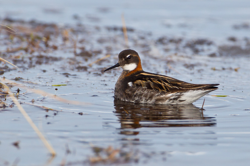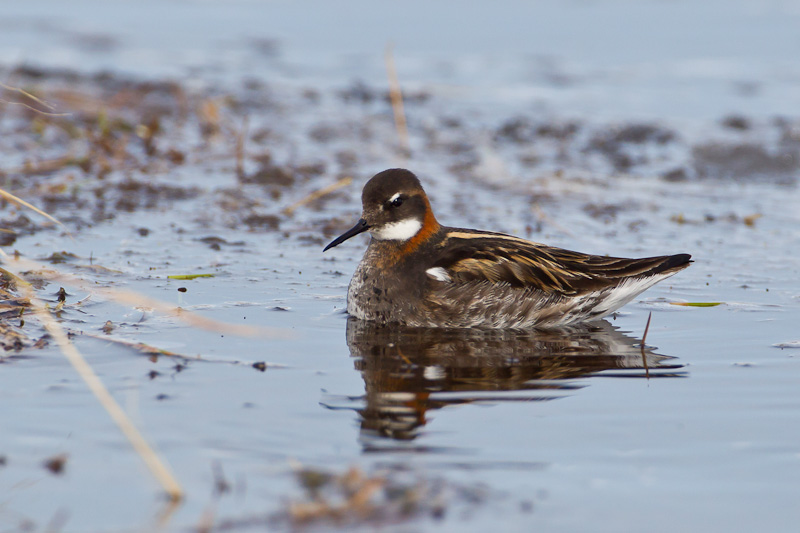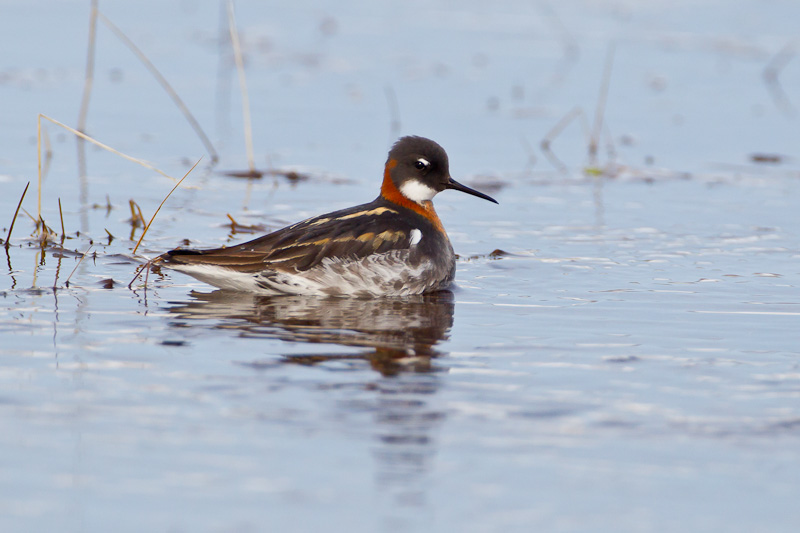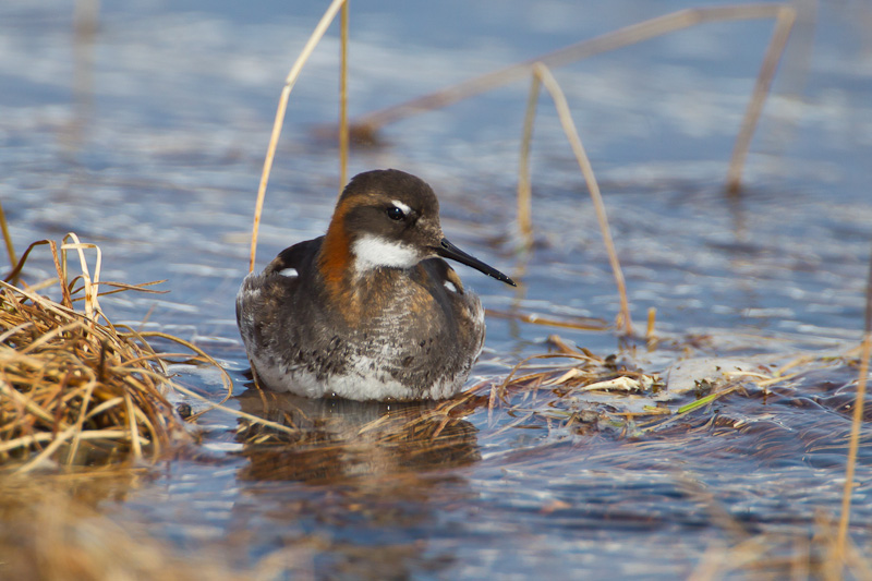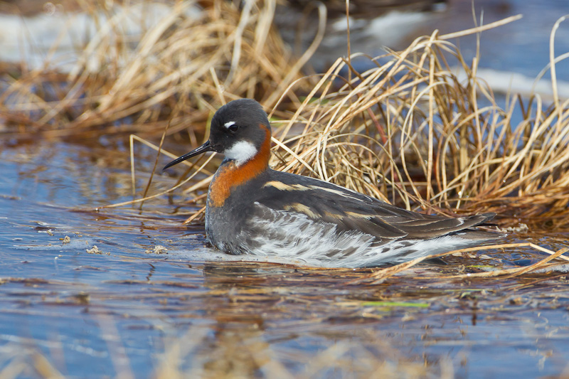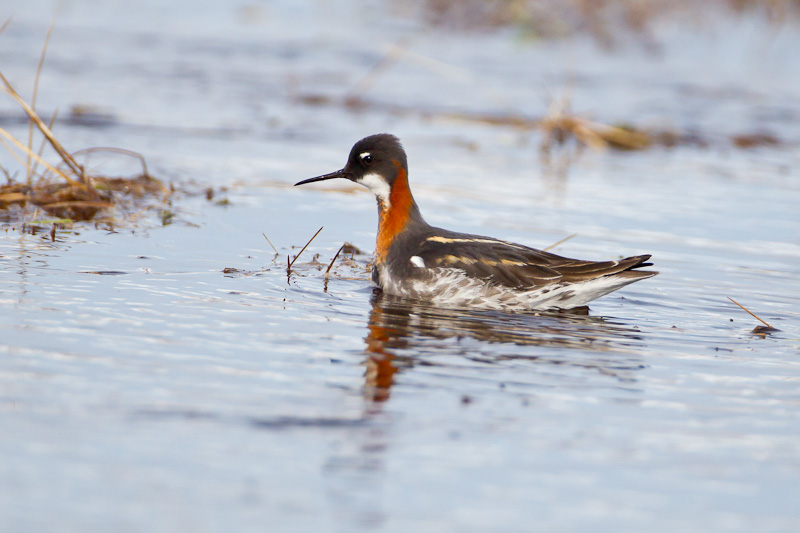 | The Red-necked Phalarope (Phalaropus lobatus) breeds across northern Canada and Alaska where it may be a common spacies at some locations. In migration it may be seen in huge numbers off both coasts of the U.S. It winters mainly at sea in the Southern Hemisphere. The shots on this page were taken at Gambell, St. Lawrence Island, Alaska, in May, 2012, with a Canon EOS 1D Mark IV and an EF 500mm F/4 L IS lens and 1.4X extender. The first four shots show females. |