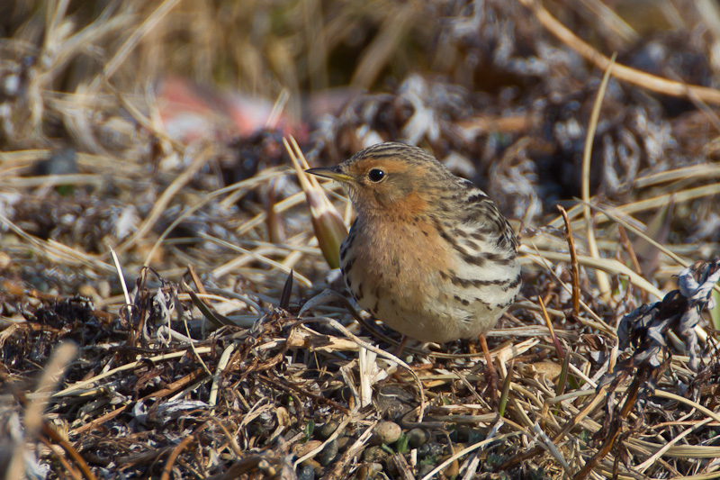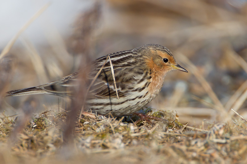 | The Red-throated Pipit (Anthus cervinus) is an old world species that is a regular but fairly rare visitor to western Alaska and other areas of the United States and Canada west coast. The first five images on this page were taken at Gambell, St. Lawrence Island, Alaska, in May, 2012, with a Canon EOS 1D Mark IV and an EF 500mm F/4 L IS lens and 2X extender. | ![]() |
