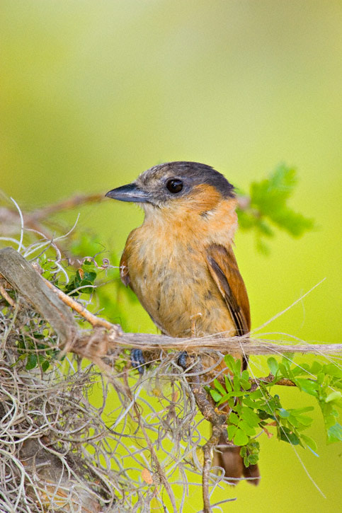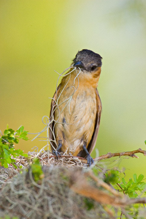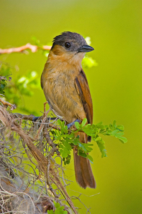 | The Rose-throated Becard (Pachyramphus aglaiae) is a tropical species ranging from Mexico into Panama. The species occasionally makes an appearance in south Texas and perhaps a couple of dozen or so such visits have occurred over the years. In late spring, 2006, a female Rose-throated Becard showed up in the parking lot of Santa Ana N.W.R., Hidalgo Co., Texas. The bird built a nest, but as far as anyone ever knew, there was no male in the area. The images here were shot in June, 2006 with a Canon EOS 1D Mark II and EF 600mm F/4 L IS lens and a 1.4X extender. |
