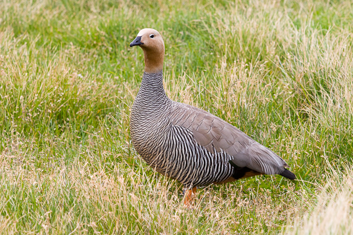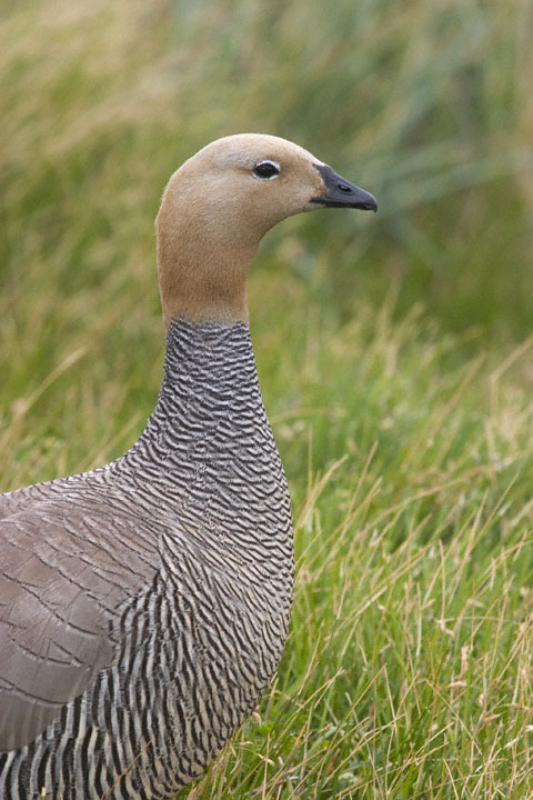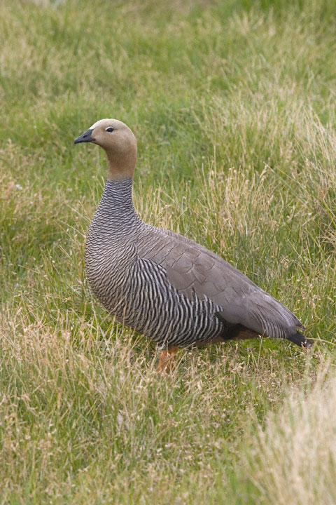 | The Ruddy-headed Goose (Chloephaga rubidiceps) is a fairly rare goose of the Patagonian steppe of southern Argentina and Chile. It also occurs on the Falkland Islands. It is somewhat similar in appearance to a female Upland Goose (C. picta) which is far more common. The bird in the first three images on this page was photographed on New Island, Falkland Islands, in January, 2004, with a Canon EOS 10D and EF 70-200 F/2.8 L IS lens and 1.4X extender. | ![]() |