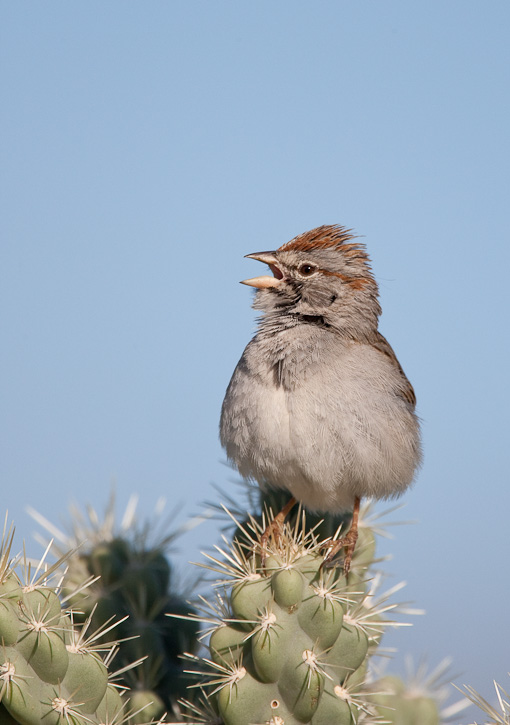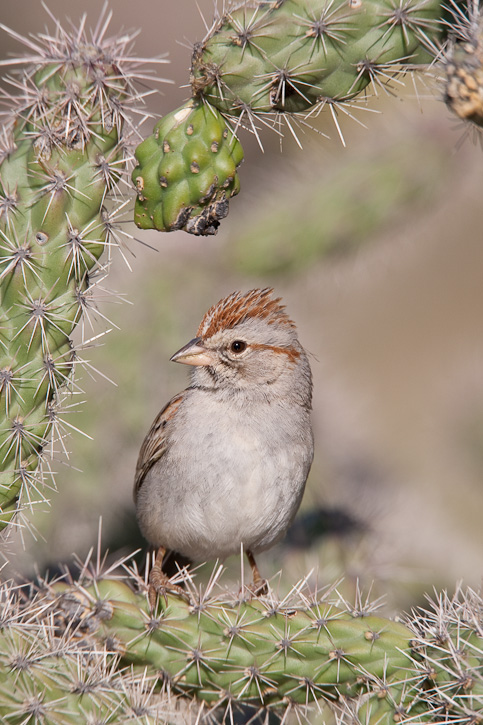 | The Rufous-winged Sparrows in the next 3 shots shown here were in Catalina, Pima Co., Arizona, in March, 2009. These images were taken with a Canon EOS 1D Mark III and EF 800mm F/5.6 L IS lens. This desert species will readily perch on cholla and other cactus, unlike many other species in that habitat. |