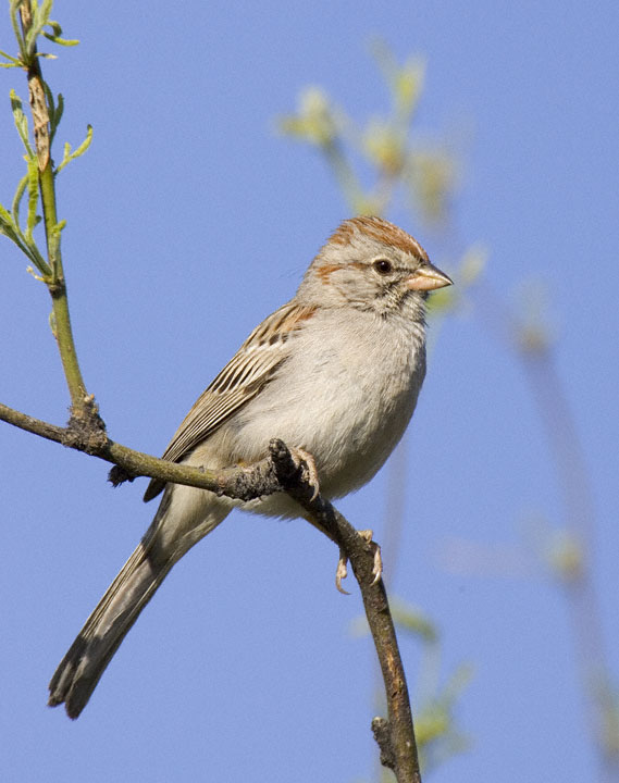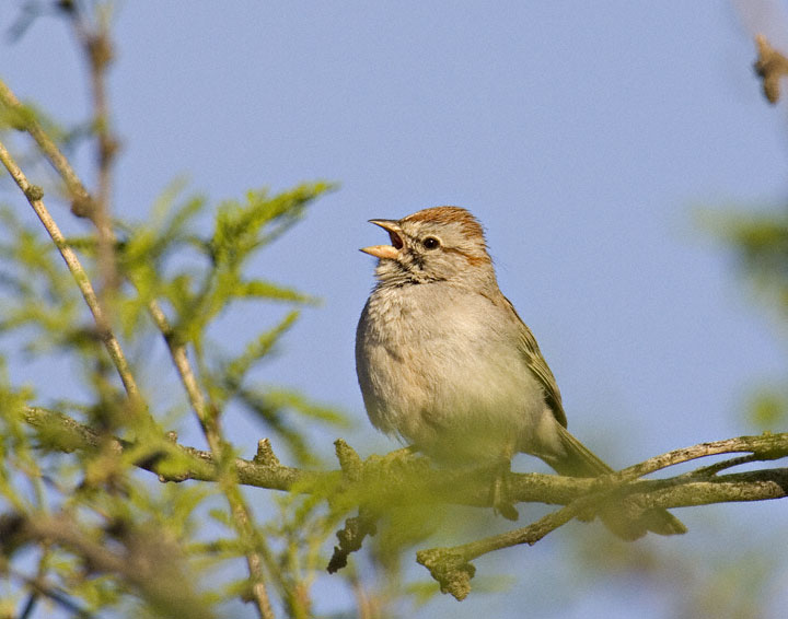 | Rufous-winged Sparrow (Aimophila carpalis) is a species of northwest Mexico and a small area of the southwestern United States. It is often found in mesquite grassland and mesquite shrub in somewhat of a desert habitat. The male shown here was photographed in Tucson, Pima Co., Arizona, in April 2005, with a Canon EOS 1D Mark II and EF 600mm F/4L IS lens and 2X extender with a Gitzo tripod. |