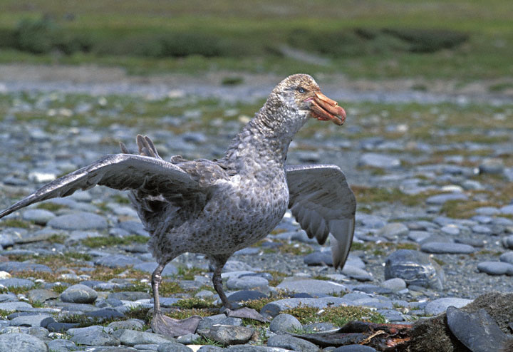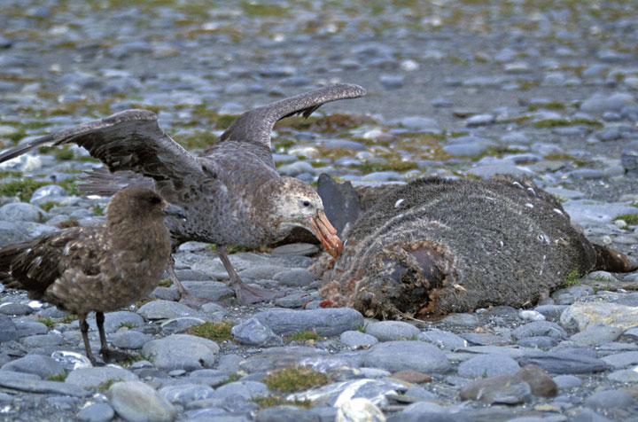 | Here are several shots taken on the island of South Georgia, in January, 2002, with a Canon EOS 1V and EF 70-200 F/2.8 L IS lens. These Antarctic Giant-Petrels are feeding on a fur seal carcass and showing some of the interesting posturing and displays they often do in this situation to try to keep other giant-petrels and skuas away from the carcass. |