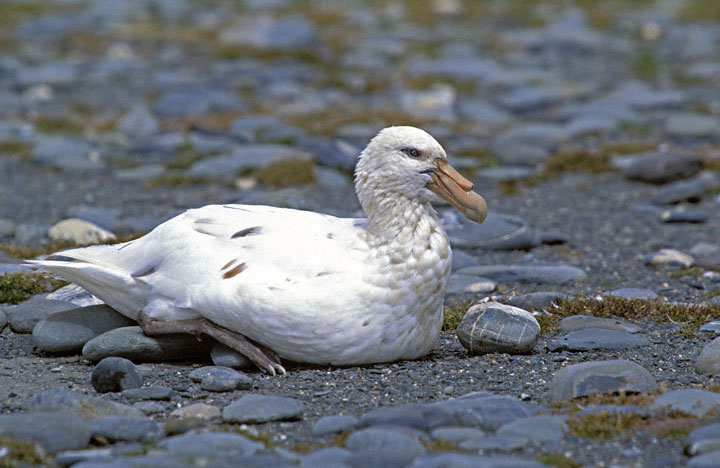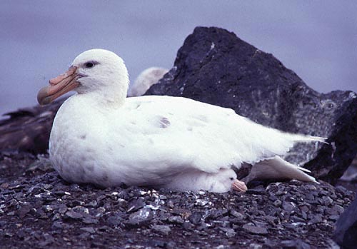 | The Antarctic Giant-Petrel (Macronectes giganteus), also known as Southern Giant-Petrel by some authors, is a circumpolar resident of the southern oceans and Antarctic seas as far south as the pack ice. The species has several color morphs including the fairly unusual white morph seen at right. This bird (with a tiny chick visible) was photographed at Hannah Point, Livingston Island, Antarctica, in January, 1996. The photograph was taken with a Canon T-90 & FD 400mm F4.5 lens mounted on a tripod with Fuji Sensia 100 film. |
