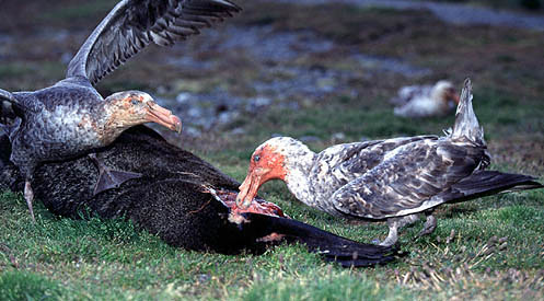 | Visitors to the southern oceans sometimes do not realize that Antarctic Giant-Petrels fill the niche of vultures in these areas. The pair of birds at right was feeding on a fur seal carcass at Fortuna Bay, South Georgia, on 26 January 1999. The photo, from a series of nearly 90 images, was taken with a Canon EOS 1N & ED 70-200mm F2.8L lens with fill flash on Fuji Sensia 100. The camera and lens were hand-held. |