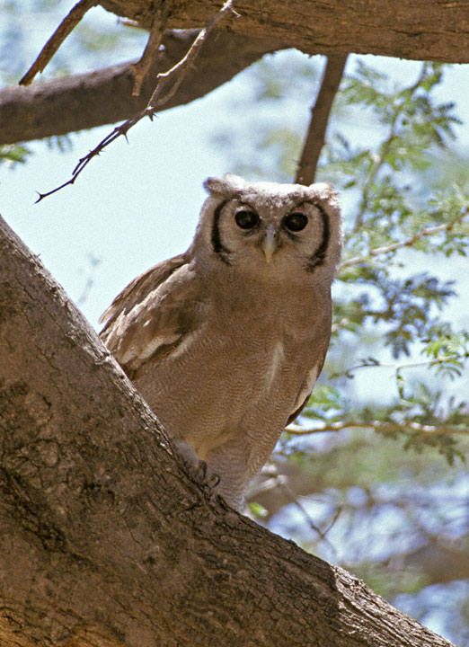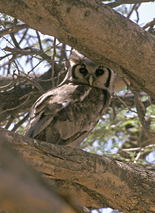 | This Verreaux's Eagle-Owl (Bubo lacteus) is also known as Giant Eagle-Owl. It is a resident over much of southern Africa. The individual shown here was spotted in a large tree in the Huab River Valley, Namibia, in October, 1998. The shots were taken with a Canon EOS 1N and EF 300mm F/2.8 L lens and 2X extender on Fuji Sensia. | ![]() |