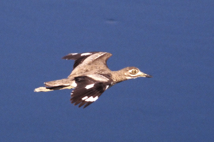 | Water Dikkop (Burhinus vermiculatus), also called Water Thick-Knee by some authors, is a common resident of aquatic habitats in southern Africa. This bird was flying near it's nest (see below) on the Okavango River near Shakawe, Botswana, in October, 1998. The photos were taken with a Canon EOS 1N & EF 300mm F4L IS lens hand-held on a BushHawk shoulder mount. The film used was Ektachrome Elite 200. Shutter speed unrecorded but probably 1/250 second. | ![]() |