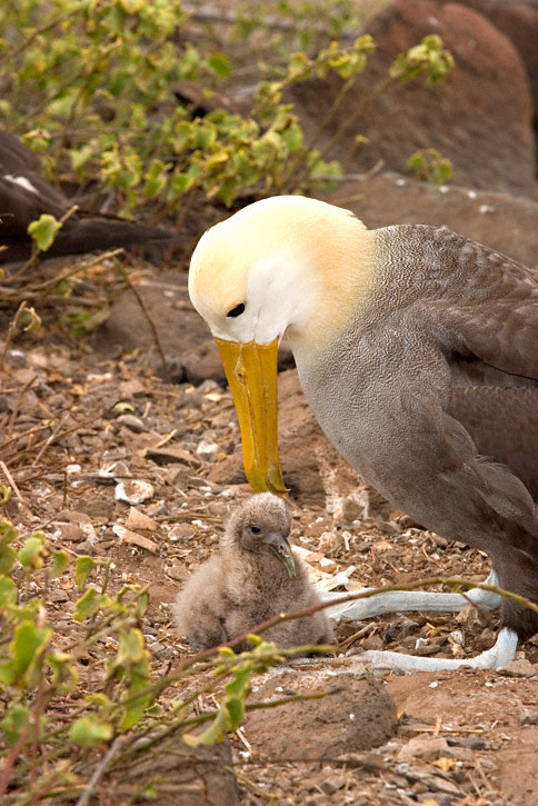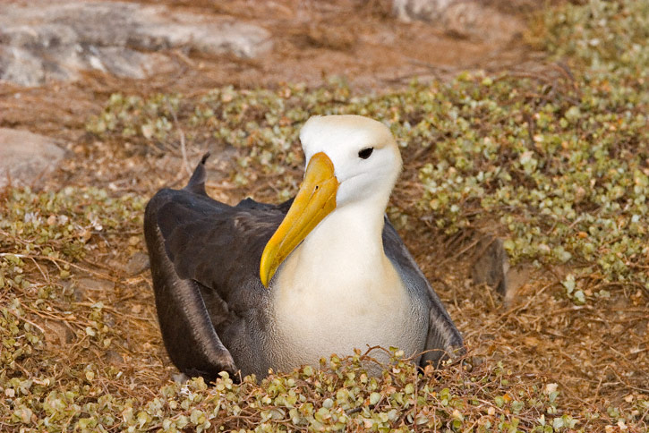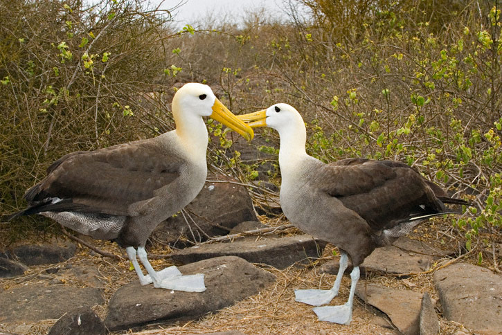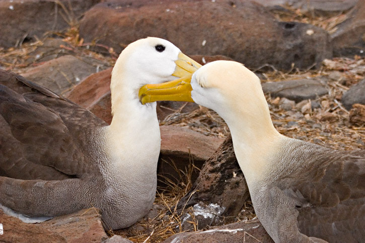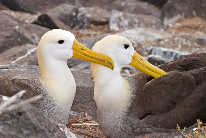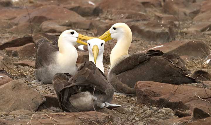 | The Waved Albatross (Phoebastria irrorata) breeds on Hood Island in the Galapagos off the coast of Ecuador. It is rarely encountered away from the Galapagos but there are a few extralimital records. The first 11 digital photos shown here were taken on Hood Island in July, 2003, with a Canon EOS 10D and an EF 70-200 mm F/2.8 L IS lens. The shot at right shows a pair with a bystander that seemed to be more interested in me than the conversation occurring between the other birds. See below for other shots. |