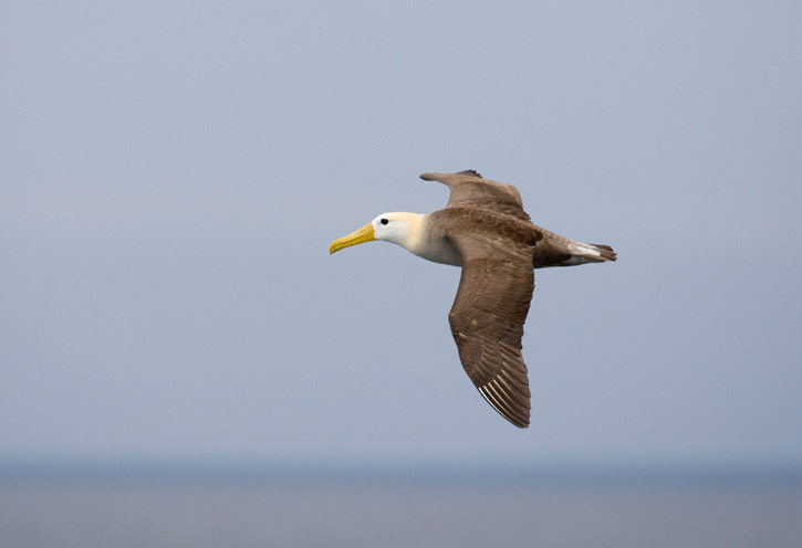 | I was able to make another visit to the Galapagos Islands in July, 2007, and again visited Hood Island. The next 8 flight shots of Waved Albatross were taken with a Canon EOS 1D Mark III and EF 500mm F/4 L IS lens. |
