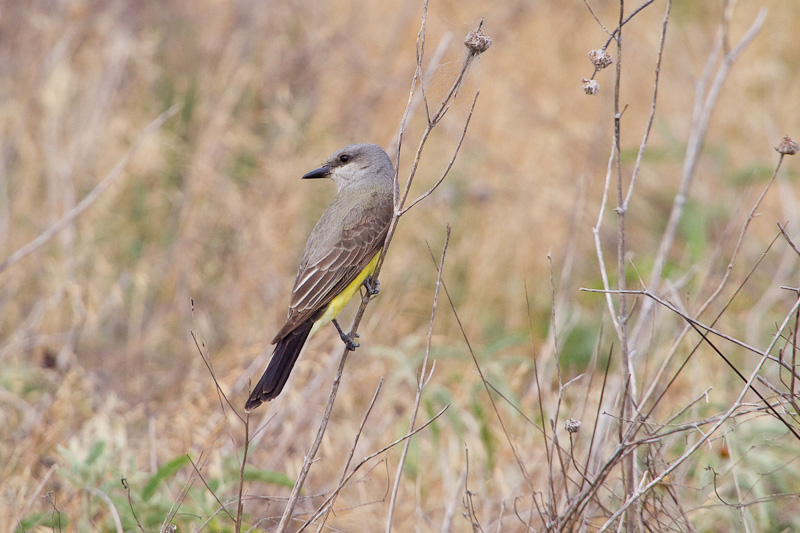 | The next three images show a Western Kingbird working a weedy field in Austin, Travis Co., Texas, in June, 2011. The bird caught a large grasshopper just after these shots were taken and flew to a nearby power line to eat its meal. These three shots were taken with a Canon EOS 1D Mark IV and a Sigma 50-500 lens. |