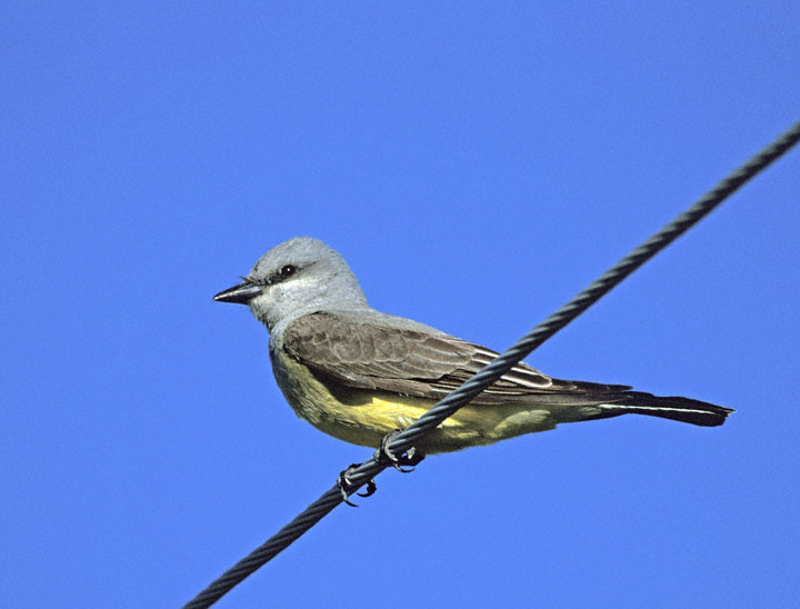 | The Western Kingbird (Tyrannus verticalis) breeds over the western half of the United States. The bird shown here was a spring migrant at South Padre Island, Cameron Co., Texas, in April, 1997, and was photographed with a Canon T-90 and Sigma 500mm F/4.5 lens and 1.4X extender on Fuji Sensia. The bird below on the wire shows a typical view of a Western Kingbird across most of the western U.S. This one was in Weld Co., Colorado, in June, 2001, and was photographed with a Canon EOS 3 and EF 600mm F/4 L lens and 1.4X extender on Fuji Velvia. |