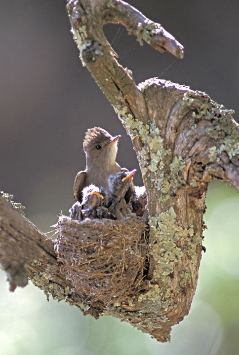 | The Western Wood-Pewee (Contopus sordidulus) breeds across much of western North America from Alaska south into Mexico. It is a common flycatcher in many locations and its voice is one of the familiar summer bird songs to many people within its range. The shots here were taken in the Davis Mountains, Jeff Davis Co., Texas. The shot at right was taken in June, 2005, with a Canon EOS 1D Mark II and EF 600mm F/4 L IS lens and 1.4X extender. The shot on the right of an adult bird at a nest with young was taken in June, 1998, with a Canon EOS 1N and EF 300 mm F/4 L IS lens and 1.4X extender. | ![]() |