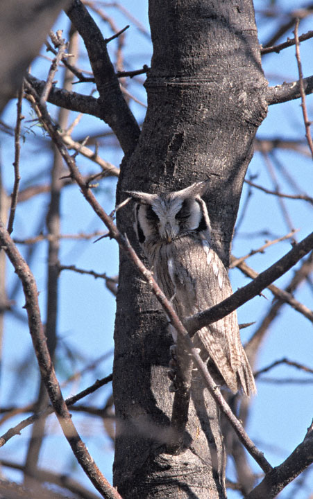 | The White-faced Scops-Owl (Otus leucotis), also simply called White-faced Owl by some authors, is widespread across the savannas of Africa. It often nests in abandoned stick nests of small hawks, but will also use a nest hole in a tree as well. The first individual was photographed in Halali Camp, Etosha National Park, Namibia, in October, 1998. This bird was giving a rarely heard cat-like cry when photographed. The photos were taken with a Canon EOS 1N & EF 300mm F4L IS lens with a 1.4X extender and a 540 EZ flash on a Really Right Stuff flash bracket. The film was Fuji Sensia 100. The flash bracket elevated the flash high enough to avoid "red eye" which is often a problem when photographing owls. The camera and lens were hand-held on a BushHawk shoulder mount. The next shot shows another White-faced Owl at a day roost, also in Etosha National Park a few days later. | ![]() |
