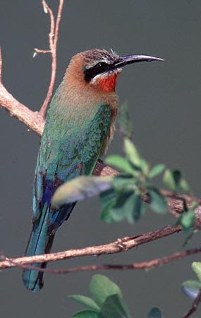 | The White-fronted Bee-Eater (Merops bullockoides) is a cavity nester in earthen banks in many areas of southern Africa. The birds below were photographed near their nesting burrows at Shakawe Lodge, Botswana, in October, 1998. They were photographed with a Canon EOS 1N & EF 300mm F4L IS lens and a 1.4X extender. A 540 EZ flash was used as fill at f5.6 on three of the shots; the photo at the bottom right was taken with available natural light. Note how the fill flash photos show the underparts to better advantage. The film was Fuji Sensia 100 on all images. These photos were all shot hand-held with the camera and lens on a BushHawk shoulder mount. Scroll down for a shot of the fairly unusual yellow-throated form of this species. |