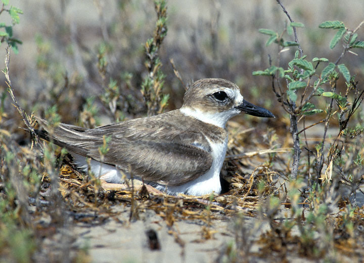 | The Wilson's Plover (Charadrius wilsonia) is quite distinctive among the smaller plovers typically found on Texas beaches due to its especially long and thick bill. It normally nests quite near the beach, but this particular female had a nest with three eggs (two of which later hatched) about 25 miles inland from the Gulf of Mexico in Kenedy Co., Texas. On the photo of the bird sitting on the nest one of the eggs is barely visible just above the bird's right foot. The photos shown here were taken in June, 2000, with a Canon EOS 1N & EF 600mm F4L lens with a 1.4X extender. The camera and lens were mounted on a vehicle window mount. The film used was Fuji Velvia pushed one stop. | ![]() |