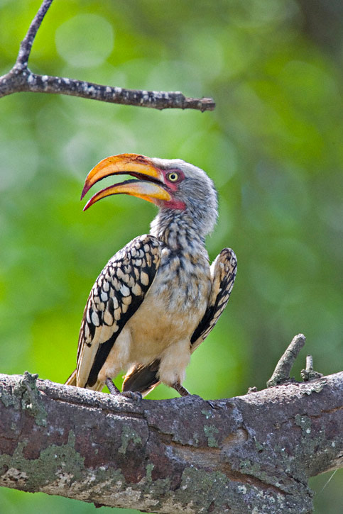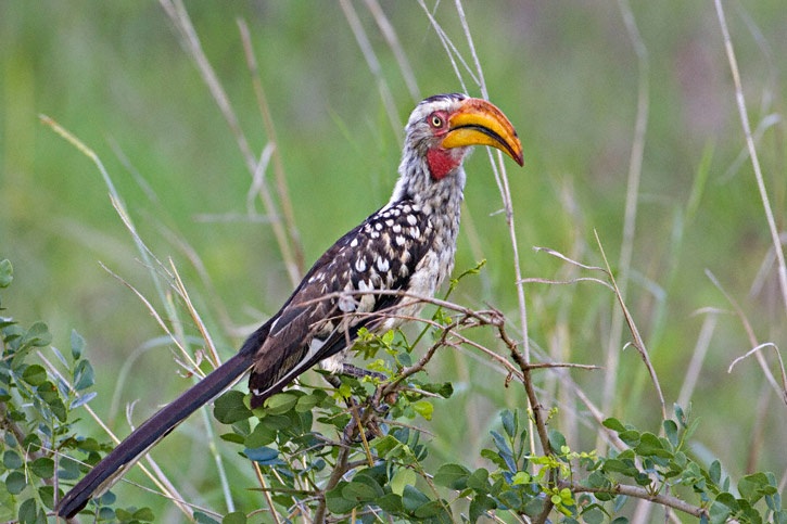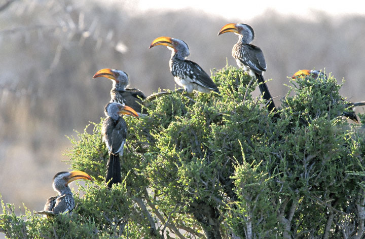 | The Southern Yellow-billed Hornbill (Tockus leucomelas) is a common resident in southern Africa. They are commonly seen in scrub and dry woodland areas. The shot of the single bird on the right and the group together on a bush in the next image were photographed with a Canon EOS 1N & EF 300 mm F2.8L lens and a 2X extender in Namibia in 1998. Normally, I do not generally like bird photos that are back lit, but the one of the birds on the bush with their yellow bills highlighted worked out Okay. | ![]() |