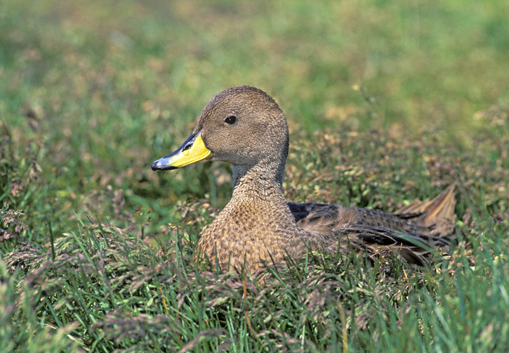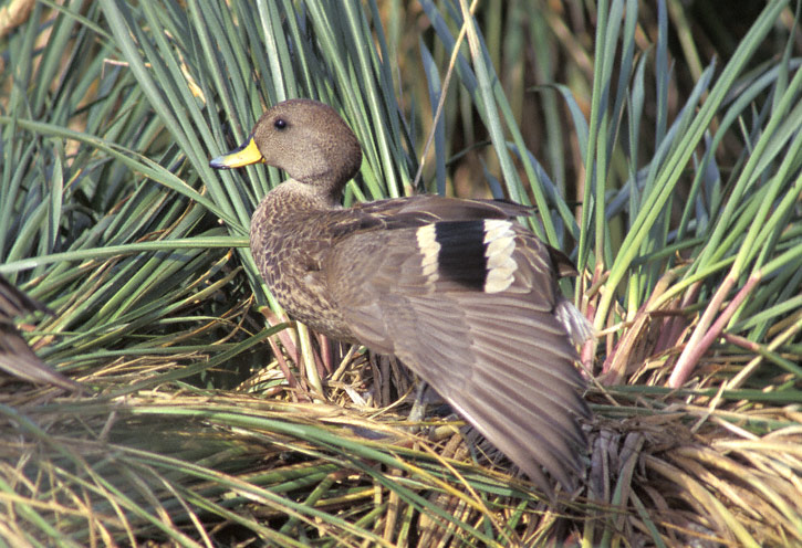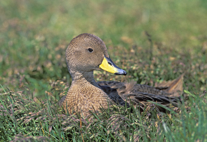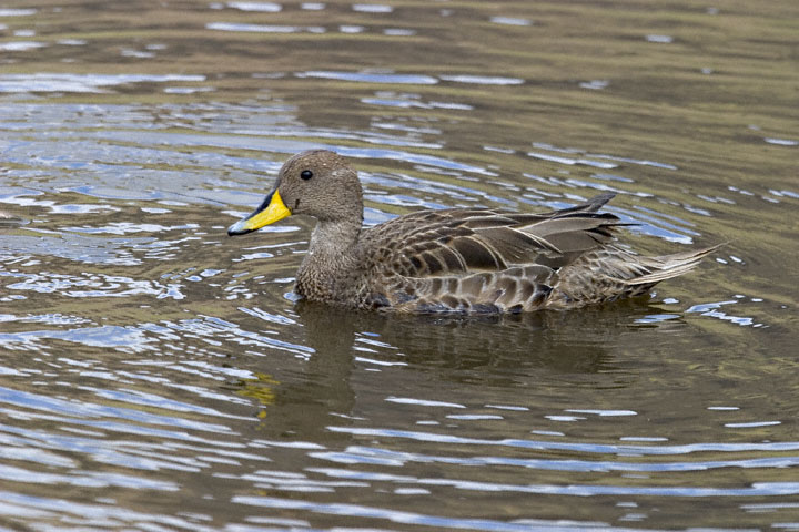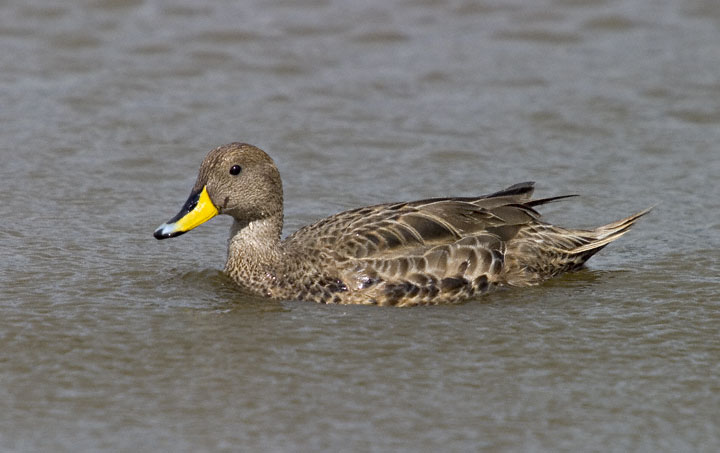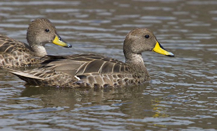 | The Yellow-billed Pintail (Anas georgica) is a widespread duck of southern South America. The nominate race of the bird, which occurs only on the island of South Georgia, is called the South Georgia Pintail (A. g. georgica). The digital shots on this page show South Georgia Pintails at Stromness, South Georgia, in January, 2004, and were taken with a Canon EOS 10D and EF 70-200mm F/2.8 L IS lens and 2X extender. There are thought to be only about 1000 to 1500 pairs of this subspecies on South Georgia. |