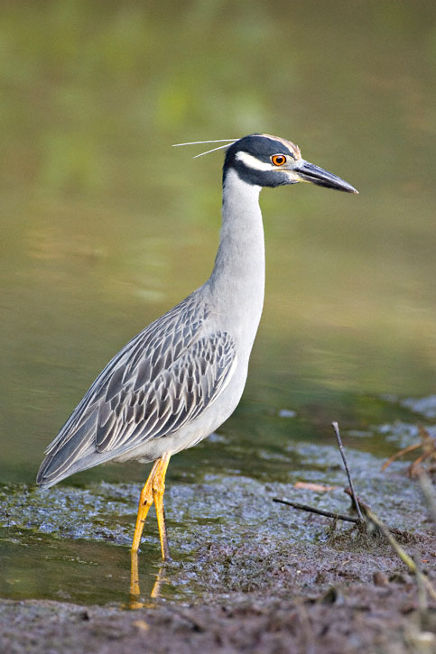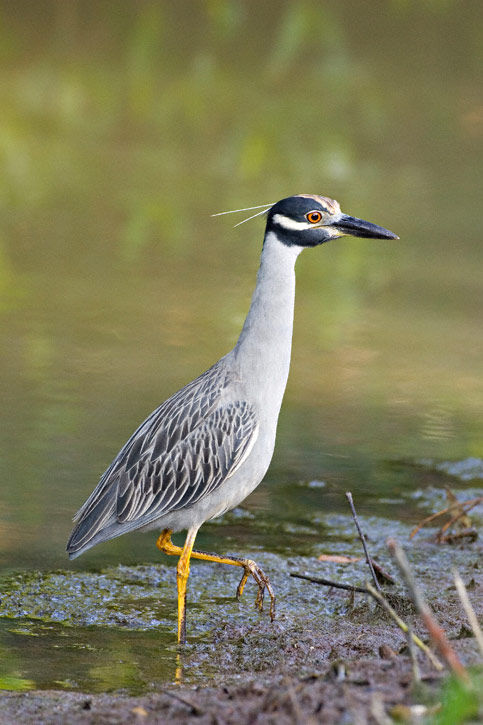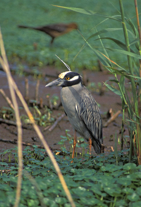 | As the name implies, the Yellow-crowned Night-Heron (Nyctanassa violacea) is often a nocturnal feeder, but it is often active during the day as well. The adult shown here was photographed at Anahuac N.W.R., Chambers Co., Texas, in April, 1996, with a Canon T-90 and Sigma 500mm F/4.5 lens and 1.4X extender on Fuji Sensia. The wid was blowing which the two plumes on its head to stand up. |